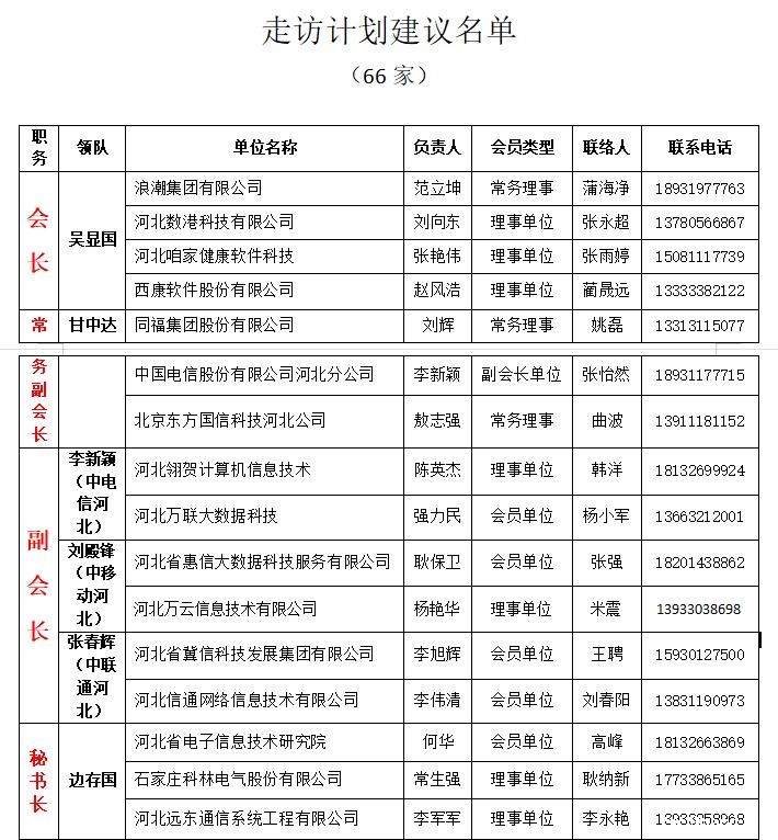 走访活动由会长、副会长、秘书长,部分常务理事和联合会中层部门负责人带队,组成走访组,深入会员企业开展走访调研,走访组成员,由领队选定,走访计划根据会员单位分布情况和业务类型拟定(每组走访3-5家)。2022年,重点走访列入联合会数字赋能县域发展对接平台的会员企业和科研机构。(走访计划建议名单附后)