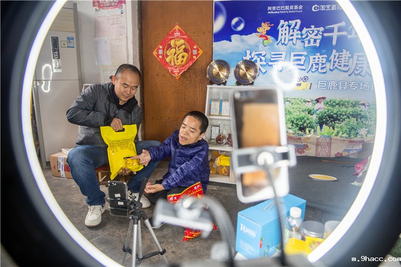 图为巨鹿县大留庄村村民李成宝(右)在进行网络直播。阿里巴巴供图