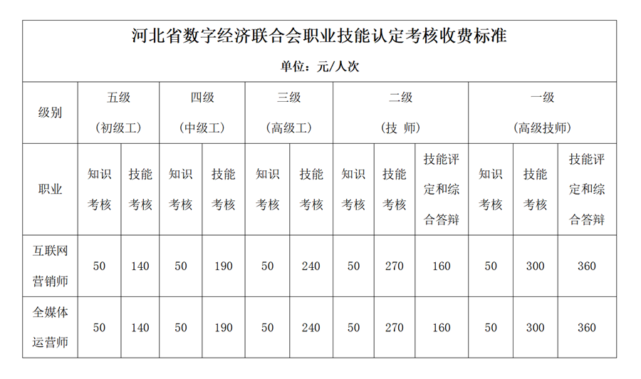 根据《河北省职业技能等级评价机构申请事项办理指南(试行)的通知》(冀人社函〔2022〕88号)文件要求,我单位获批为河北省职业技能等级认定社会评价组织。机构备案号为S000013000126,开展认定的职业(工种)范围为:互联网营销师(直播销售员)(五、四、三、二、一级),全媒体运营师(直播运营)(四、三、二、一级)。依据《关于进一步规范全省职业技能鉴定考核收费标准等事项的通知》(冀价行费〔2018〕86号)和《关于进一步明确技能人才评价职业分类的通知》(冀人社字〔2020〕291号)现将收费标准公示如下: